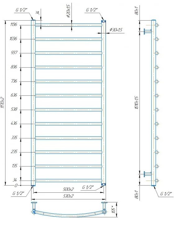 Водяна рушникосушарка INOX Класік 1170х530/500 діаметр підключення G1/2'', складається з 12 ребер. Характеристика товару: Має розміри: висота - 1170 мм; ширина - 530 мм; міжцентрова відстань - 500 мм; глибина - 100 мм. Теплова потужність рушникосушарки - 308 Вт. Варіанти підключення рушникосушарки нижне або діагональне. Рушникосушарка Класік 1170x530/500 поєднує в собі не лише привабливий зовнішній вигляд, надійність й практичність, а ще можливість зробити комбінований виріб за допомогою підключення ТЕНа і крану під ТЕН. Рекомендована потужність ТЕНа – 300 Вт. Крани та ТЕН ви можете переглянути в аксесуарах до рушникосушарки. Рушникосушарка виготовлена за новітніми технологіями із нержавіючої сталі марки AISI 304, товщина стінок труби - 1.5 мм.