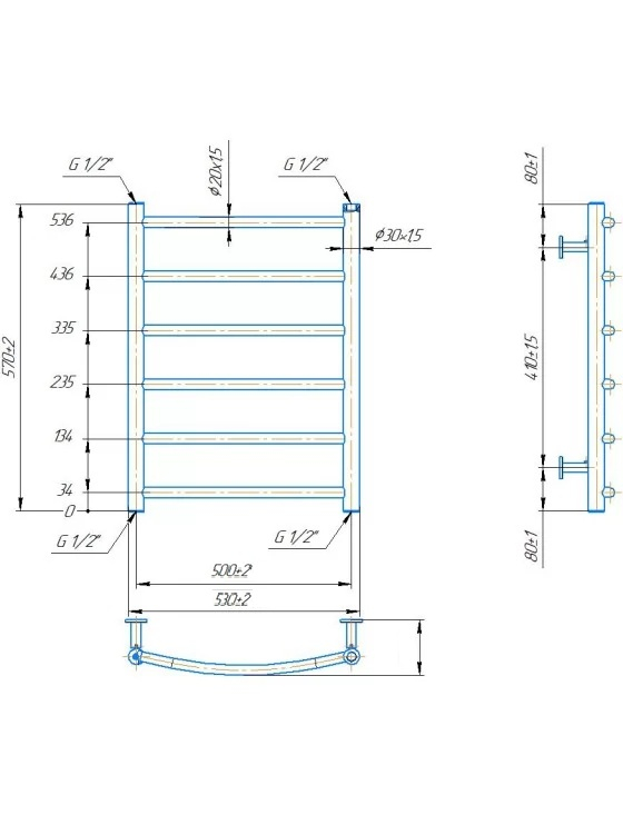 Водяна рушникосушарка Класік 570x530/500 діаметр підключення G1/2'', складається з 6 ребер. Характеристика товару: Має розміри: висота - 570 мм; ширина - 530 мм; міжцентрова відстань - 500 мм; глибина - 85 мм. Теплова потужність рушникосушарки - 155 Вт. Варіанти підключення рушникосушарки нижне або діагональне. Рушникосушарка Класік 570x530/500 поєднує в собі не лише привабливий зовнішній вигляд, надійність й практичність, а ще можливість зробити комбінований виріб за допомогою підключення ТЕНа і крану під ТЕН. Рекомендована потужність ТЕНа – 120 Вт. Крани та ТЕН ви можете переглянути в аксесуарах до рушникосушарки. Рушникосушарка виготовлена за новітніми технологіями із нержавіючої сталі марки AISI 304, товщина стінок труби - 1.5 мм.