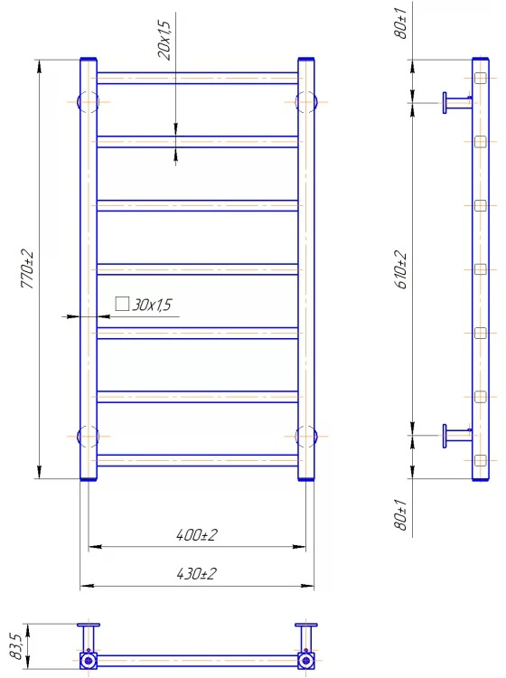 Полотенцесушитель INOX Токио 770×430/400 — современное решение для ванной комнаты, сочетающее стильный дизайн, эффективный обогрев и долговечность. Модель имеет размеры: высота — 770 мм, ширина — 430 мм, глубина — 83 мм, межосевое расстояние — 400 мм и стандартное подключение G1/2". Конструкция включает 7 рёбер, изготовленных из высококачественной нержавеющей стали с зеркальной полировкой — без хромирования, что обеспечивает устойчивость к коррозии и длительный срок службы.